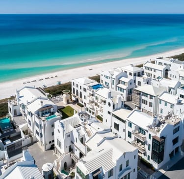 Alys Beach homes draw from Mediterranean courtyards and Caribbean resorts—smooth walls, limestone paths, and curated greenery that invite calm. We use natural materials like shellstone and coral aggregate to mirror this palette and reflect the soft coastal light of 30A.
